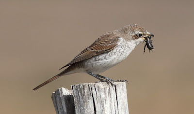 Red-backed Shrike - Lanius collurio with Black Field Cricket